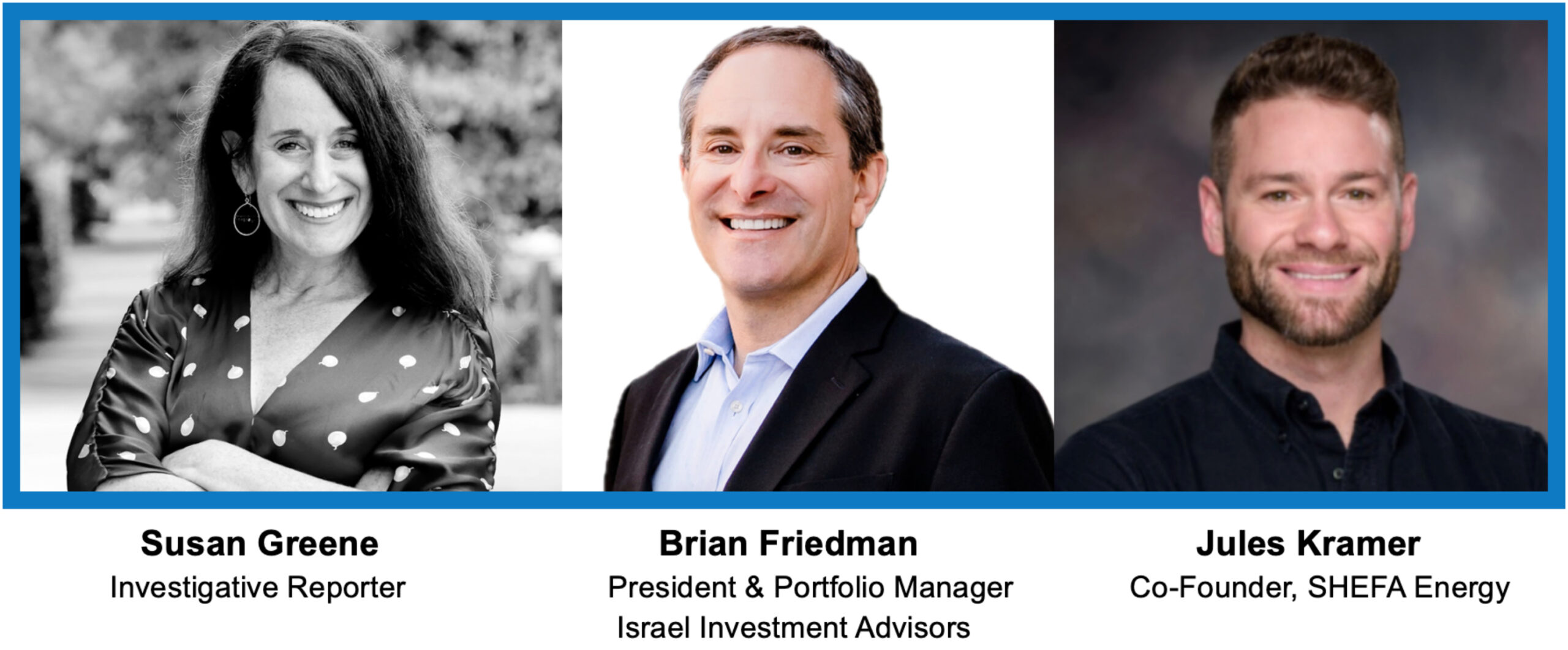 Our esteemed panel includes Jules Kramer, former IDF paratrooper who designed high-level policy missions around the Israeli-Palestinian conflict; Brian Friedman, economist, portfolio manager, and expert analyst of the Israeli financial markets; and Susan Greene, investigative reporter and senior U.S. reporter from wartime Israel.